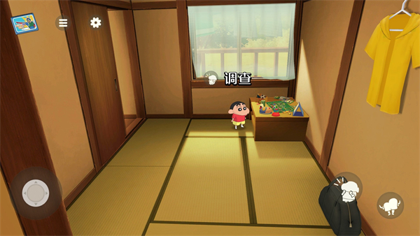使用虚拟摇杆控制小新移动,点击场景中的物品或人物进行互动,通过界面按钮使用工具或打开菜单