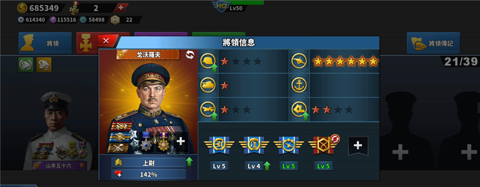 为了增强生命,游戏设置了军衔系统,玩家可以升级自己的将领军衔(花费勋章)来提高生命,并且在个人将领界面的右下角有很多蓝色技能,均为该将领的特长和相关加成,在右上侧有步兵 坦克 飞机 火炮 舰船 行军6个特长,每一颗星就可增加5伤害,比如一个坦克单位伤害为40,那么加了曼施坦因后就是65,血量也提高105%,如果移动范围是10,那么上了曼施坦因后就是16,上其他将就以此类推。
