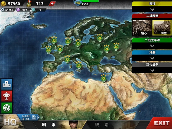剧本方面是关于战役,一共分为 教程 二战欧洲 二战太平洋 冷战 现代战争,其中二战部分分为轴心 同盟 欧洲轴心11关部分主要为德国 意大利 同盟11关部分为苏联 英国 美国;太平洋轴心9关部分为日本 同盟9关部分为美国,冷战分为华约 北约 各6关,现代战争讲述联合国军队对抗恐怖组织,目前只有联合国9关并基本涉及世界大国。