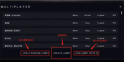 ②在多人游戏的底部,我们可以看到三个选项,分别是【加入随机房间】、【创建房间】和【输入ID加入房间】