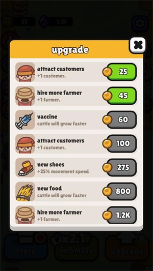 3、点击右下角的upgrade可以解锁各种升级,这些升级需要消耗一定数量的金币。