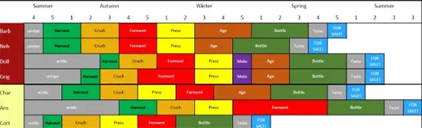 图中绿色表明收获时间,浅土黄色破皮压榨、红色发酵、黄色压榨、棕色陈化、深绿色装瓶、灰色葡萄酒鉴赏。这些都是加工酿造环节移步下个章节