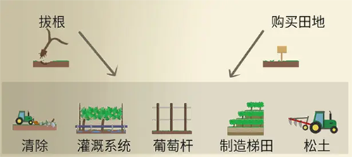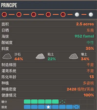 葡萄生长受土地特性影响。开始种植的选址决定了葡萄品种品质。其中土地特性分为海拔高度、土壤酸碱度、土壤成分(砂土、黏土、壤土)游戏中每块地的游戏特性会用三种颜色衡量,绿色》 橘色》红色)。 选址时尽量选择该品种下有至少2项绿色数值的土地。