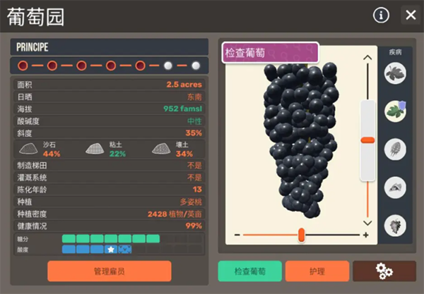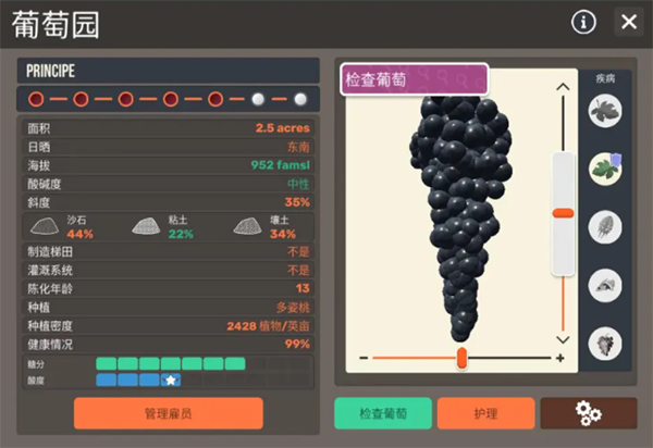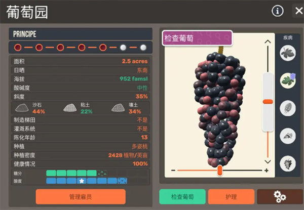3、硬核数值分析模式,观察葡萄成熟度、PH值、日晒度。