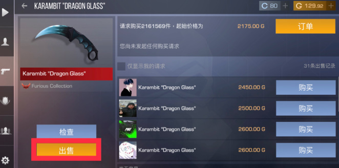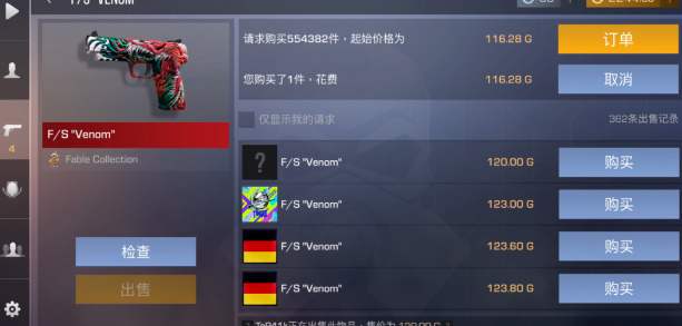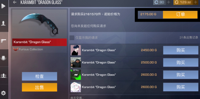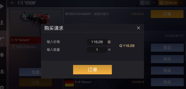 1、打电话,双方进入市场,转到交易枪械的页面,得知该皮肤的最高订单价是多少。