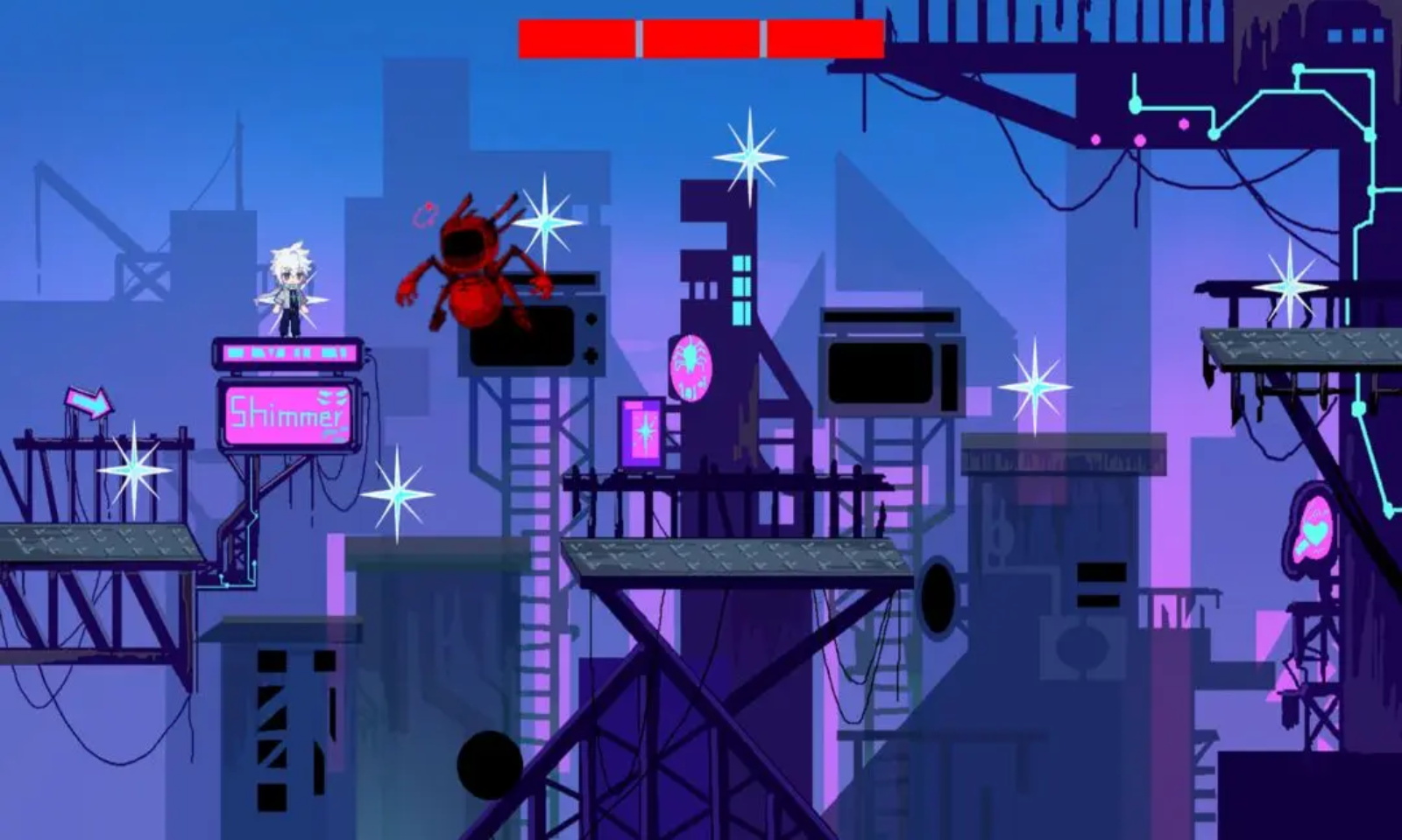 跟随闪光Shimmer的脚步,在这个赛博迷幻的横板城市里四处探索,左右穿行!——甚至是,内外穿行!最后,利用看似漏洞的行为,打败看似无法战胜的敌人。