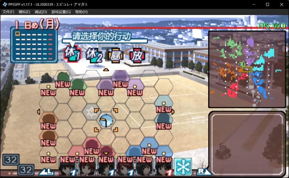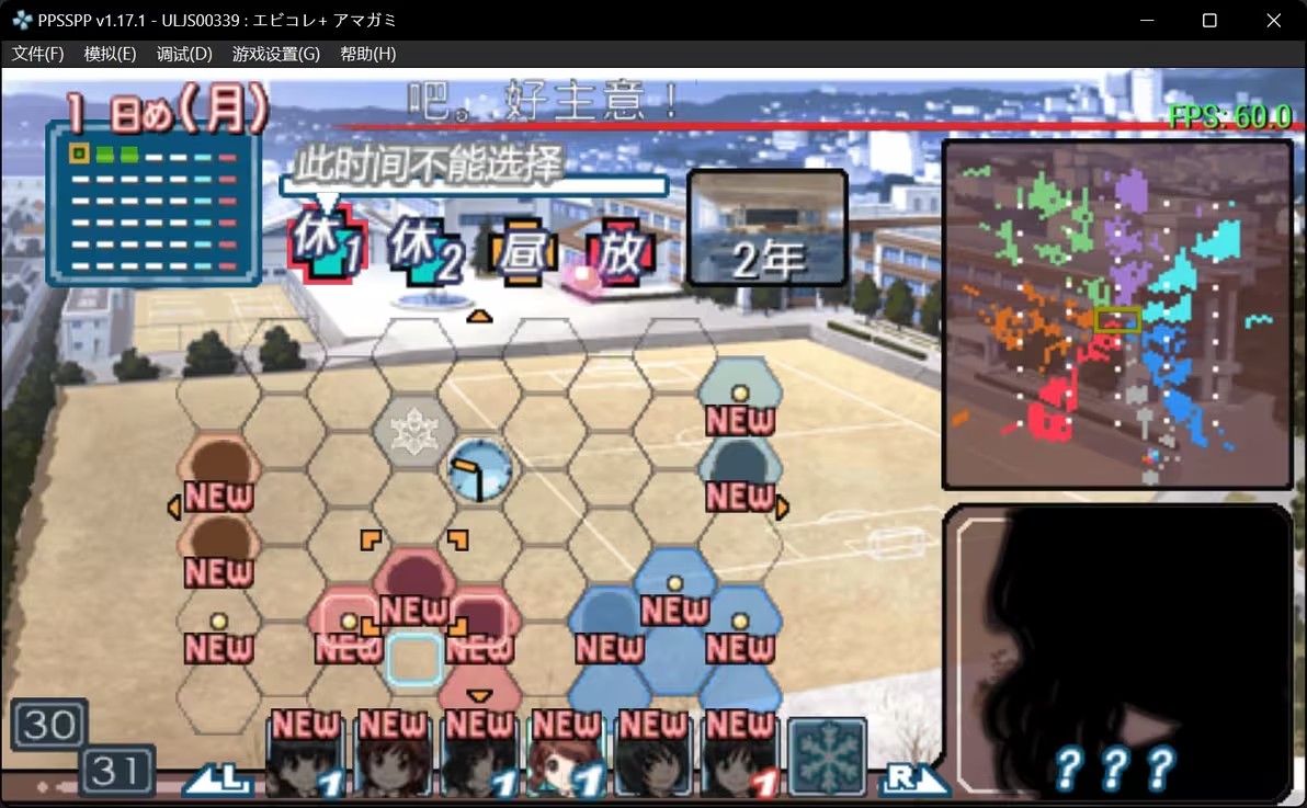 这个游戏是按照方格状的事件延续下一个事件去推进的,首先来看第二张图,屏幕中间我选择了一个事件,左上角的绿色方块代表这个事件会持续几天,往右边这里有四个时间,这个游戏总共有六块时间,早晨的上学路→上午1→上午2→中午→放学后→晚上,其中上学路和晚上是强制进行的事件,不占用玩家操作时间,你一天总共有四个时间段可以自由选择事件,从上午1到放学,事件可选择的时间是红点显示,每选择一个事件或者跳过就会进行下一个时间段,所以回来看我选的这个事件,他代表了1-3天可以选择这个事件,然后现在我是上午1,这个事件可以在放学这个时间段选择,这游戏总共41天,最后一天是圣诞节,必须选择一个结局。