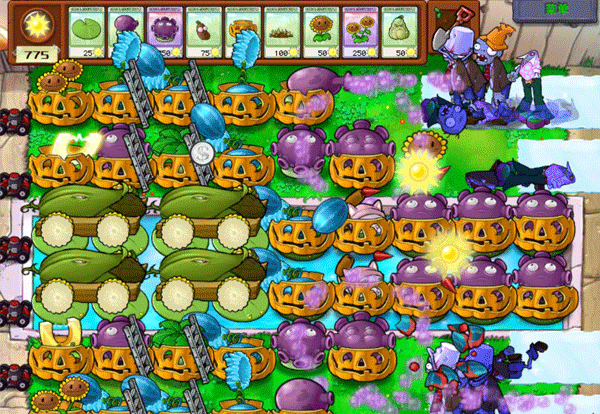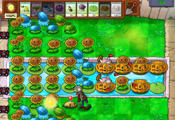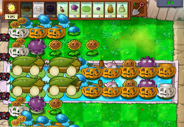 种3排花,并且把河里的六个都升级成双花。在3排花种满之前,出来的僵尸一律用土豆雷炸死。2个土豆雷的回复速度应该是够的,带上一个窝瓜以防万一。3排花种满以后,种2排西瓜,一排南瓜,然后前面放几个地刺。对付水里的铁桶僵尸,用水草把它干掉。