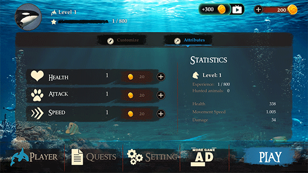 2、用金币能增加属性点,可以看到虎鲸的详细数据,点击play就可以开始游玩了