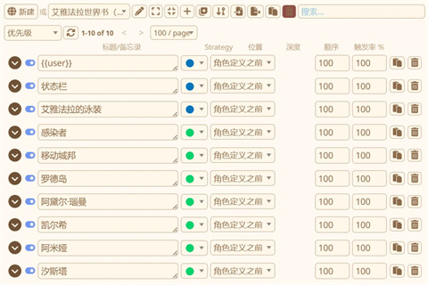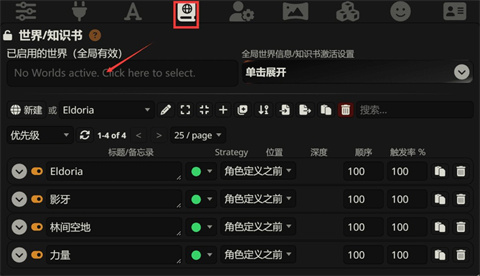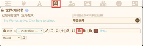 导入世界书完毕后,我们可以在下图的位置设定默认打开的世界书(允许多个)。酒馆AI输出的过程中,按照“API、预设、人物卡、人物书、世界书”的顺序,默认左高右低的优先级进行思考输出。