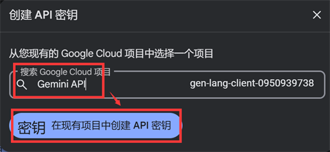 随后我们点击左上角的“Get API key”,然后在弹出菜单中继续选择“Create API key”。如果你这里显示的是中文,就点击“创建API密钥”。随后在弹出的页面中选择“Gemini API”项目,最后点击确定即可创建你的第一个Gemini api。