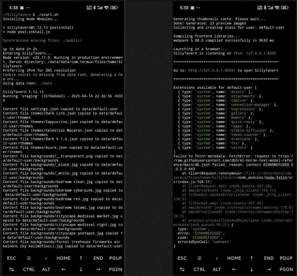 5、运行酒馆:本次运行酒馆无需再次输出“cd SillyTavern”,但是如果重启了手机或者重启了Termux,无需再次执行前面4步,只需要进入目录,然后运行“start.sh”就可以啦!