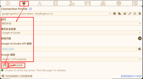4、设置api:申请api后我们回到酒馆,根据下图设置,将刚刚申请的api密钥填入,并选择好需要使用的模型。