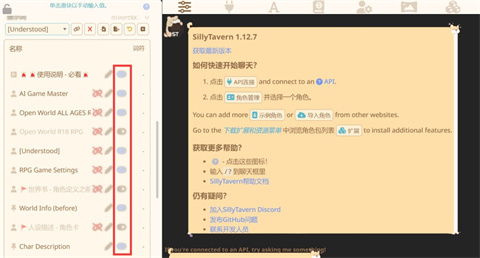 4、世界书-世界书:世界书的本体,与人物书一样,提供更详细的描述扩写,用以规范AI的创作边界。世界书一般脱离人物,主要描述整个世界范围的内容。比如国家、地区、文化、主要组织、历史等。AI可能不能马上使用这部分内容,但是对于营造故事的氛围感和未来可能存在的剧情关联,有至关重要的作用。需要注意的是,人物书只能绑定到人物卡上,最多1个,而世界书则可以同时启动多个。如下图,我们可以按照顺序点击,即可导入已经下载好的世界书。