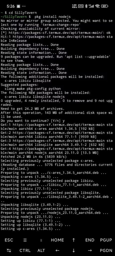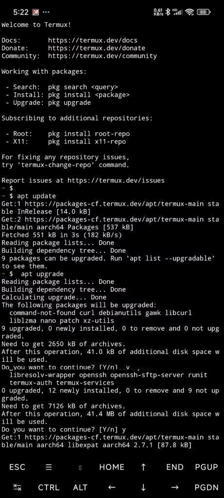 1、更新环境:首先我们需要更新Termux的依赖环境,以防止出现奇奇怪怪的问题,按顺序运行下面两条内容即可。(注意,不是一次性输入两行,而是输入一行,回车等待运行。然后再输入第二行,然后回车等待运行)如果出现更新失败,请检查梯子。另外,如果出现询问Y/N的选择,直接输入Y,然后回车。