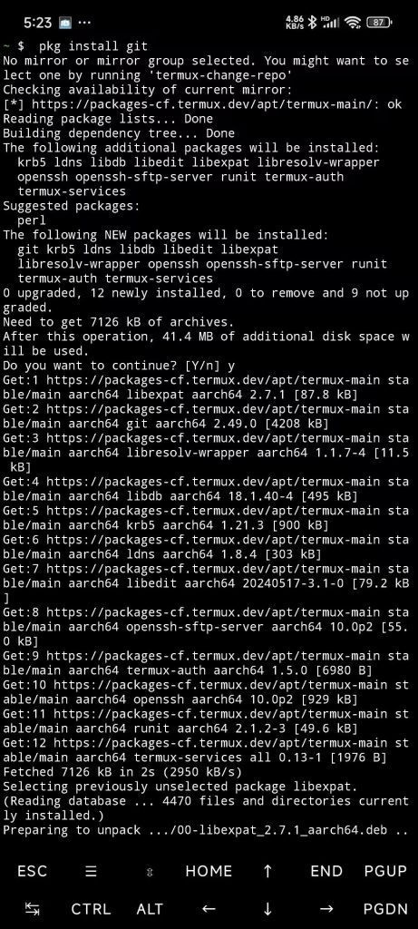 2、安装git:跟PC版本一样,我们需要安装git,方便对酒馆进行下载和更新管理,跟上面一样,输入回车等待安装。