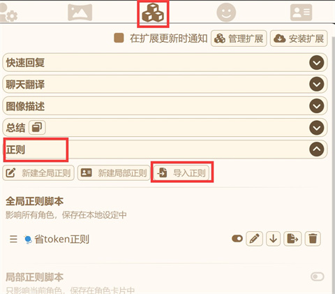 5、正则:酒馆的正则主要是对最终输入AI的文本做进一步的优化或功能叠加。不少预设必须配合对应的正则才能使用,否则会出现许多多余的显示内容(比如思维链)。正则的导入非常简单,如下图所示导入json文件即可。正则可以有全局正则和局部正则,一般根据正则的具体效果,选择导入即可。注意预设和正则都是.json文件,但两者导入的位置不一样,不可以搞混。
