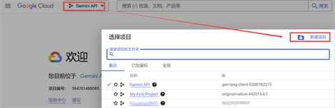 3、新建项目:需要注意的是,当前Gemini的api虽然能提供用户免费使用,但是同一个项目下的不管多少个api都受到统一的配额限制。具体来说就是每天50次gemini-pro和1500次gemini-flash的响应。理论说,如果在酒馆中使用gemini-flash,那一天1500条肯定是足够了,但是如果使用生成质量更好的pro,那么50条就会非常捉襟见肘。这时候我们可以到Google Cloud新建多个不同的项目,随后回到上一部在不同的项目上申请api,即可增加实际可用的api数量。