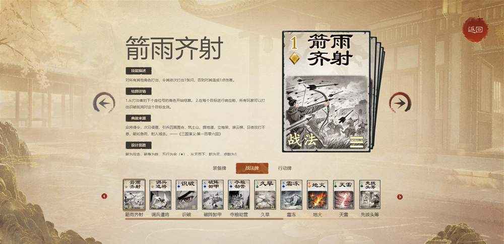 3. 纯名将设定横跨多朝代。武将池涵盖楚汉陈胜到三国诸葛亮等历史名将,技能设计全部源自历史典故。诸葛亮“锦囊妙计”能选专属战法牌,陈胜“篝火狐鸣”可让队友摸牌,每个技能都有典故说明和设计思路。