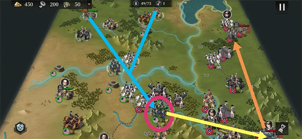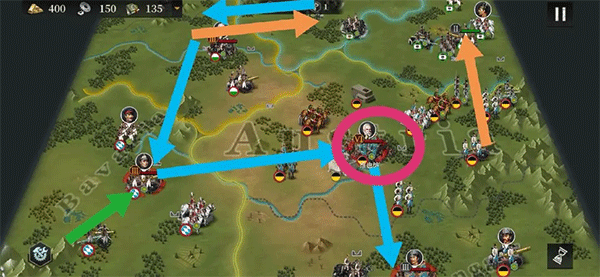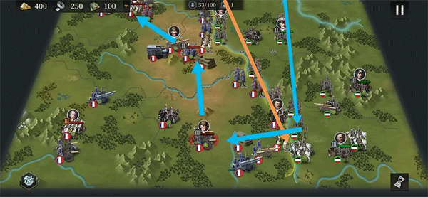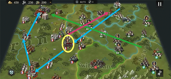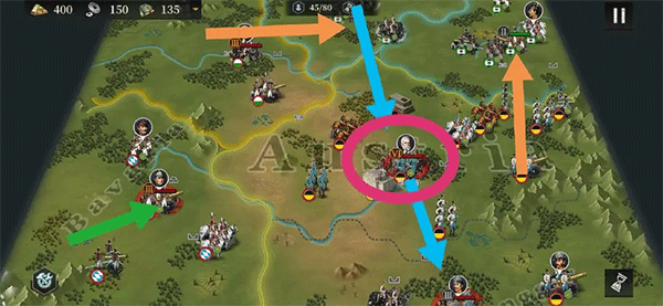 按路线走,保护好红圈将。初始城用民兵守住,二级城可以军事学院可以造强行军。