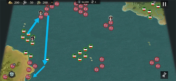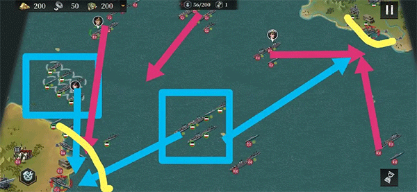 过海峡后占领第一个红圈港口,快速向前推进,在敌军过海峡前,占领剩下的两个红圈;(可以在海峡处留几艘船来堵敌军,就像敌军之前堵你一样)