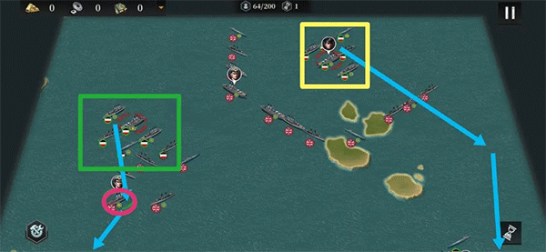 打掉绿圈将,绿圈将的队伍陷入混乱,可趁机拿下,中间上面的敌方舰队到达指定地点便不会移动了;