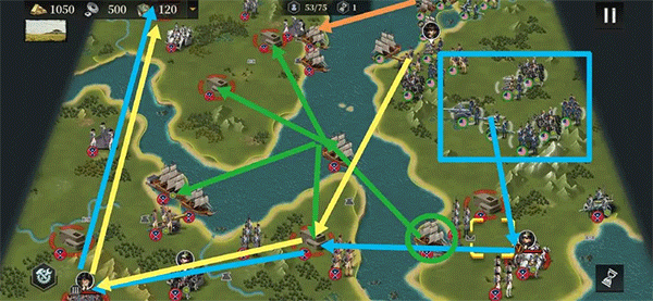 蓝框先头部队沿蓝线行军,占领右上方港口;