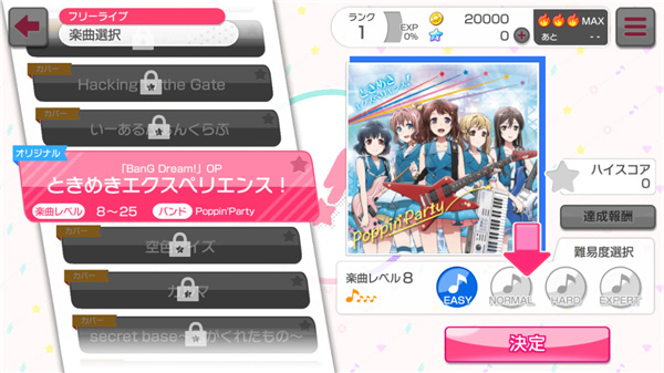 随即来到LIVE 部分,新手教学时只能打本家曲「ときめきエクスペリエンス」的其中一节,但是难度可以自选,Easy最简单,Expert最难。顺带一提,GBP 的LIVE 是非体力制的,只要想打就能随时开打,唯一会消耗的就只有画面右上方的火焰(LIVE BOOST,每三十分钟回覆一个,每一次LIVE 皆会自动消耗一个,发动后在LIVE 中获得的金币、经验值、报酬为平常五倍)。