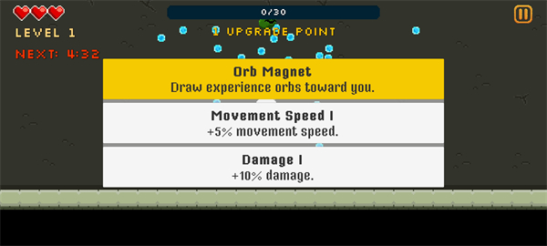 2、获得升级点数后,可在OrbMagnet(吸引以太碎片)、MovementSpeedI(移动速度+5%)和DamageI(伤害+10%)中进行选择。前期建议优先选择OrbMagnet,以提升资源收集效率。