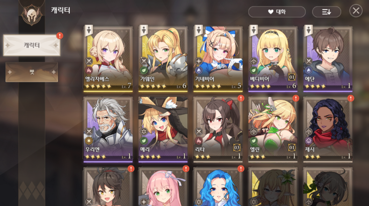 在『角色』中可以查看通过『召唤』获得的『角色』信息,包括『成长』、『装备』、『卡牌(共鸣)』、『特性』、『超越』以及角色的『简介』 “和可以确认『故事』和『服装』信息