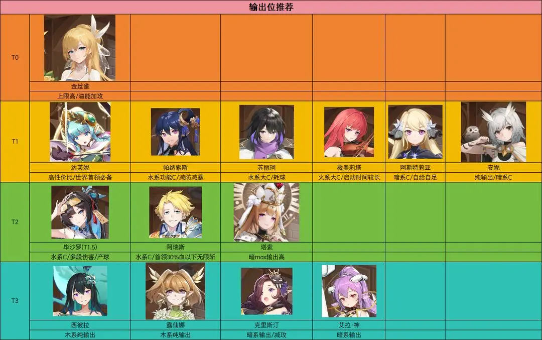 *更新毕沙罗T1.5(因为不想多拉一行所以放T2最前面)、苏丽珂升至T1(伤害明显高于T2档)
