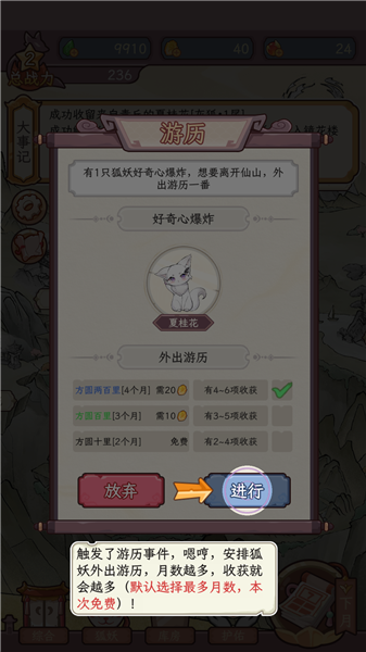 6、收留狐狸后,你可以带着它进行各种训练,也可以让小狐狸自己外出游历,可以获得各种收益;
