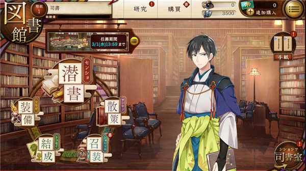 选完初始文豪开始进入图书馆界面,相当于刀男里的本丸,是游戏的开始界面,管理员的名字会自动使用DMM账号的名字,游戏里的按键和按钮都显示在画面上,点左上角可以隐藏按键,右边人物是助手,相当于刀男的近侍,近侍的更换后面司书室会讲,右上角的设置按钮可以调整声音大小,第一条ボイス是人物声音
