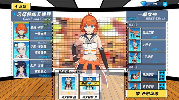 2、老婆养成:游戏中玩家可以通过完成健身任务来进行角色养成,解锁不同的教练、服装和动作。