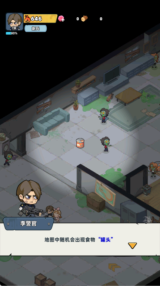 4、在室内场景中搜集随机出现的 “罐头” 等食物,保证生存资源充足。