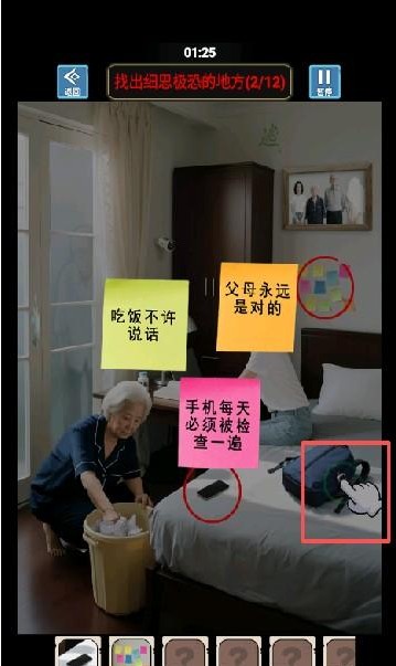 3、在每一关中仔细检查每个角落,点击可疑物品,如纸条、玩具或家具,完成任务后即可顺利通关。