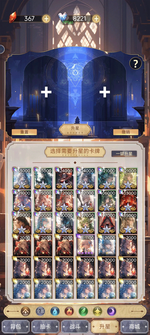 2、不要用同名ssr去升星,会浪费掉,升了也没事,可以点一键重置返还所有材料。