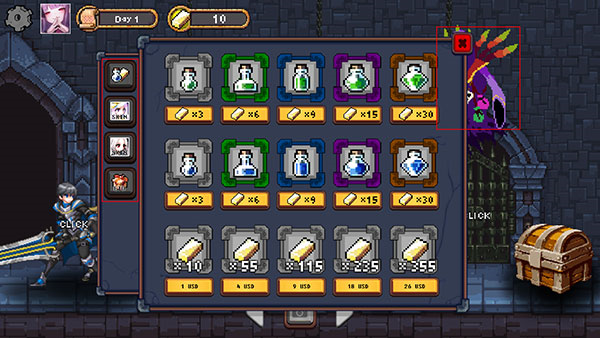 1、进入地下城与公主游戏,点击右上方漂浮魔怪可以购买各种药剂、角色和礼品,相当于商店;
