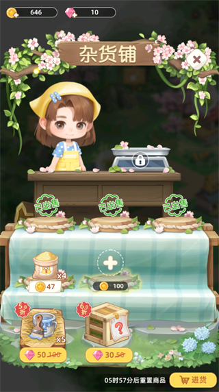 在杂货铺上架饲料、农产品等商品,利用5折优惠购买工具类道具,同时通过售卖获取金币。
