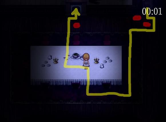 6、隐藏结局:3F曾经有一张纸条提示在下面的飞刀走廊不要东张西望(左右走),但如果无视这张纸条不去阅读就能在之后那个房间内左右行走。(1.07版本将这个判定丢入了公共存档,也就是说存在一个看过纸条的存档,就再也不可能接触到这部分内容)
