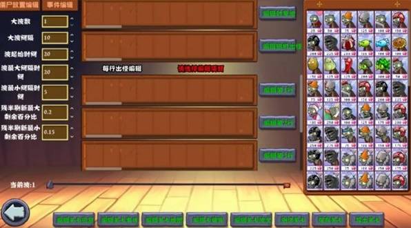8、之后点击下个按钮可以编辑关卡波次,也就是僵尸出现的波次和类型,玩家可以自由选择每行出怪的顺序和时间间隔。