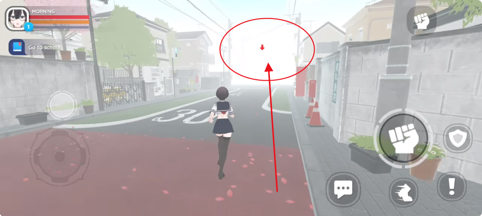 2、转动视角,切换跑步、行走、攻击,熟悉操作之后看到红色箭头,跟着箭头行动。
