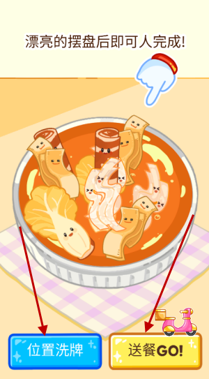8、制作完毕后,我们可以点击左侧的蓝色按键来调整食材在碗里的位置,点击右侧的黄色按键可以送餐。
