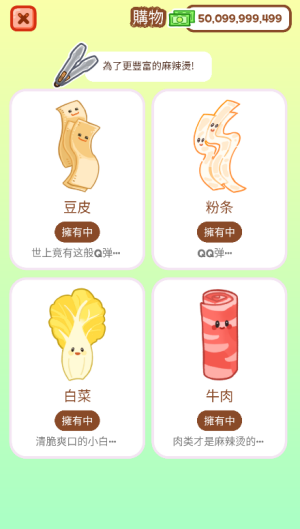 1、游戏精心设计了丰富多样的食材和配料,逼真模拟麻辣烫制作过程,让玩家亲手调配独一无二的麻辣烫口味。