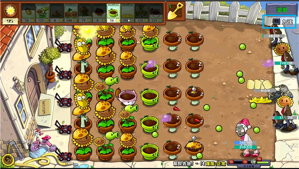 3、僵尸开始进行进攻,玩家需要时刻关注战况,及时补上新植物。