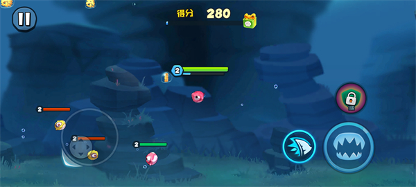 3、对局中通过虚拟摇杆控制小鱼移动,优先吞食体型比自己小的鱼类以获取积分和成长,遇到更强大的鱼需及时躲避,避免被吞噬。