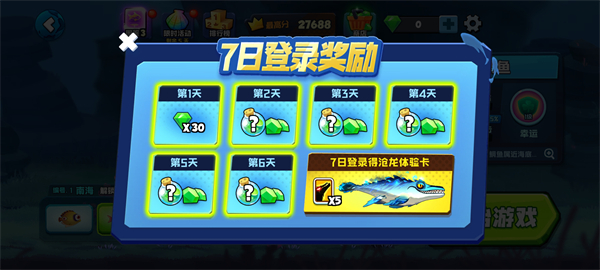 1、进入鱼吃鱼正版游戏后,先领取【7日登录奖励】,可获得钻石与多种神秘道具,第7天还能解锁沧龙体验卡,建议每日登录,确保奖励全部领取。