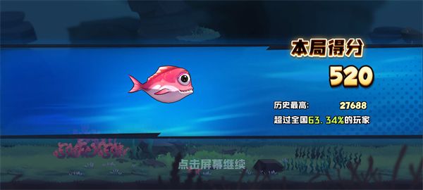 5、若被其他鱼类击败,系统将结算本局得分,并显示历史最高分及全国排名,点击屏幕即可返回主界面重新挑战。