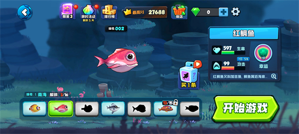 2、选择已解锁的鱼类,查看对应的生命值与攻击属性后,点击【开始游戏】进入对局。