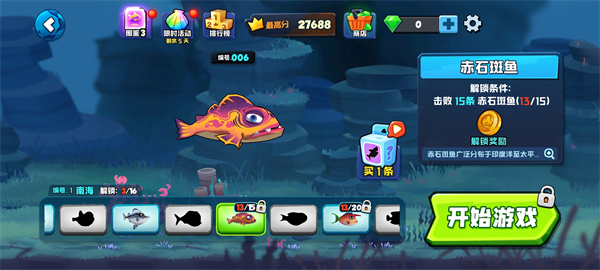 6、游戏内部分鱼类需通过击败指定数量的目标解锁,例如赤石斑鱼需击败15条对应鱼类,达成条件后即可领取金币奖励并解锁该鱼种进行使用。